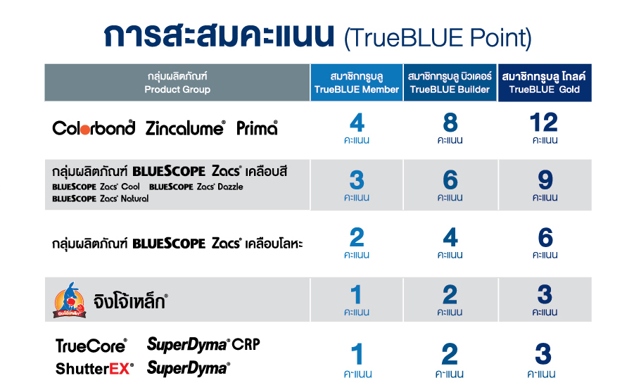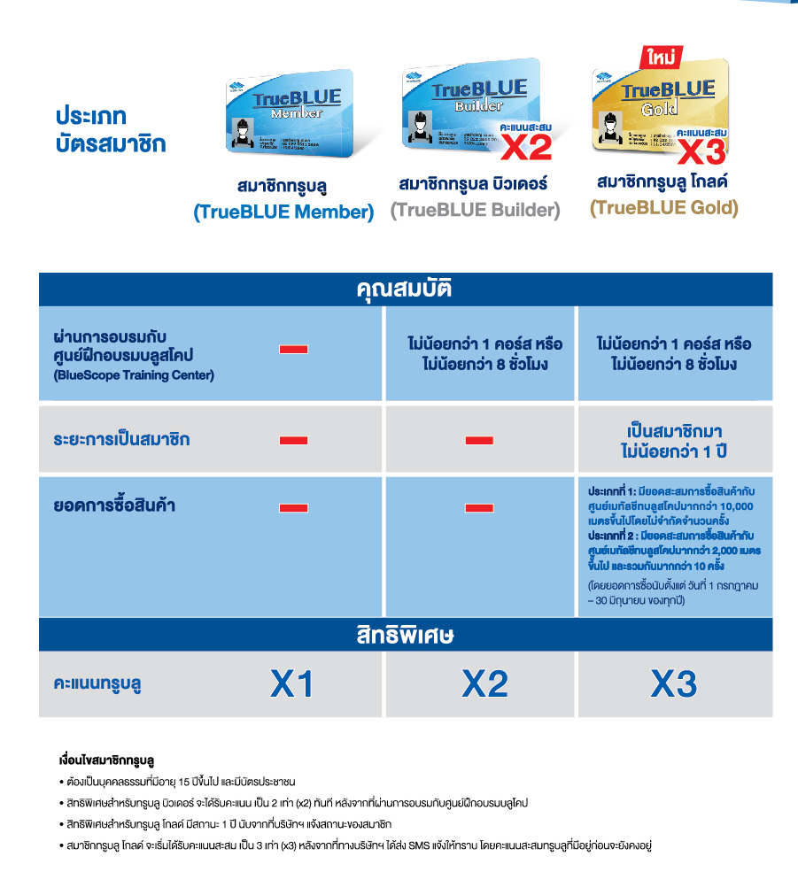 สมาชิกทรูบลู บิวเดอร์ (TrueBLUE Builder) บัตรนี้เพื่อช่างติดตั้งและช่างรับเหมาที่ผ่านการอบรมจากศูนย์เมทัลชีท บลูสโคป รับไปเลยคะแนน x2