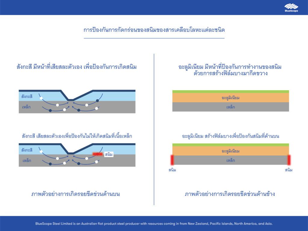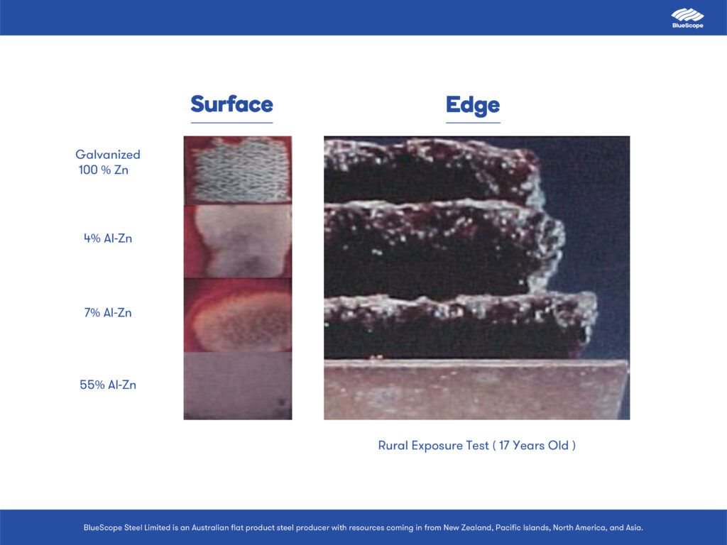 จากนวัตกรรมแผ่นเหล็กเคลือบโลหะที่มีอยู่ในปัจจุบัน หากมองเรื่องการใช้งานระยะยาว จะเห็นว่า ‘เมทัลชีทเคลือบอะลูมิเนียม 55% ผสมสังกะสี’ เป็นทางเลือกที่ค่อนข้างคุ้มค่าสำหรับการนำมาใช้ในการก่อสร้างตัวอาคาร การทำงานของสารโลหะที่ช่วยป้องกันการผุกร่อนของแผ่น ‘เมทัลชีท’ ประเภทนี้ เมื่อเปรียบเทียบกับแผ่นเหล็กเคลือบสังกะสีแบบเดิมที่ใช้สังกะสีเป็นตัวช่วยป้องกันการเกิดสนิมจากรอยขีดข่วนและขอบตัดให้กับแผ่นเหล็กด้านใน เมื่อมีอะลูมิเนียมเพิ่มเข้ามาทำหน้าที่เป็นฟิล์มสร้างเกราะป้องกันการกัดกร่อนบนชั้นผิวจากสภาพแวดล้อม จึงทำให้สามารถป้องกันการกัดกร่อนของสนิมอย่างมีประสิทธิภาพมากขึ้น โดยจากภาพจำลองการทดสอบด้วยระยะเวลา 17 ปีจะเห็นว่า สังกะสี 100% จะเกิดการผุกร่อนรวดเร็ว ขณะที่อะลูมิเนียม 55% ผสมสังกะสีจะทนทานต่อการผุกร่อนได้มากที่สุด